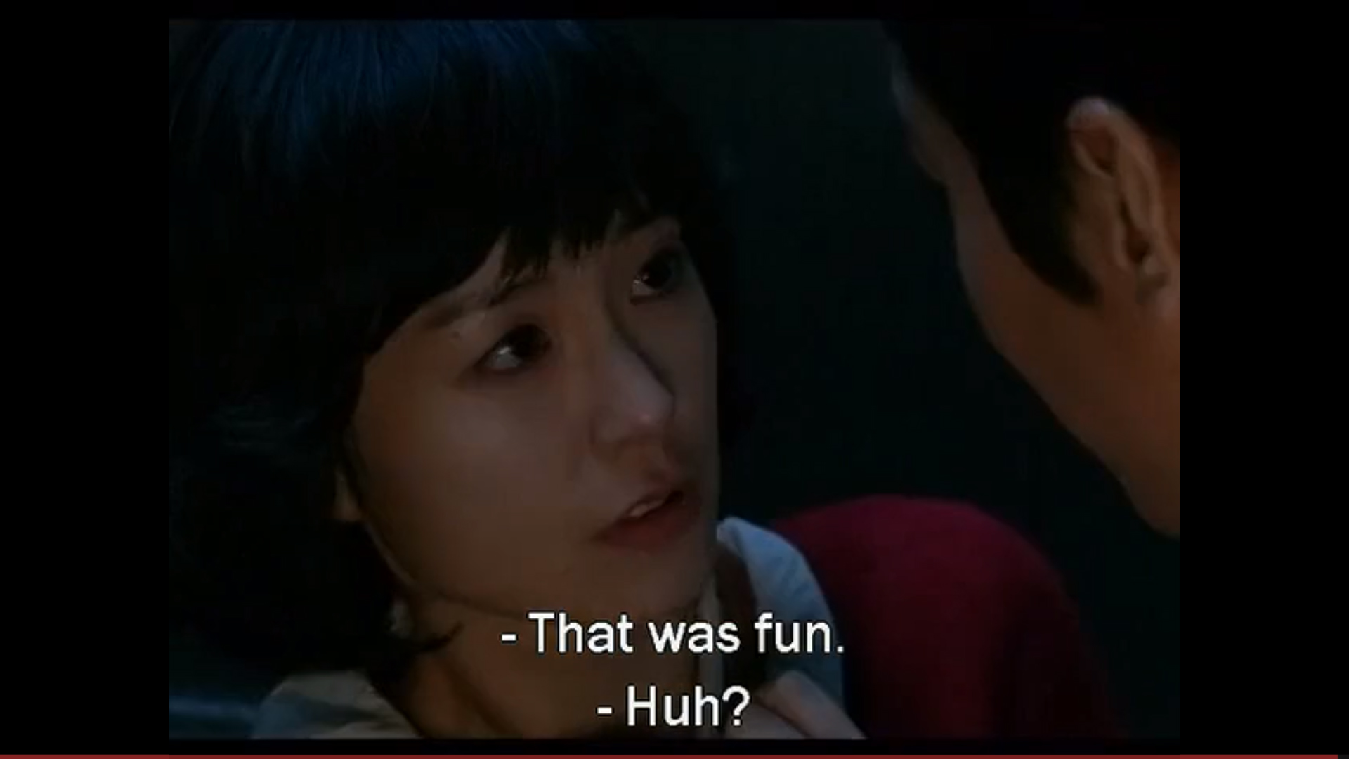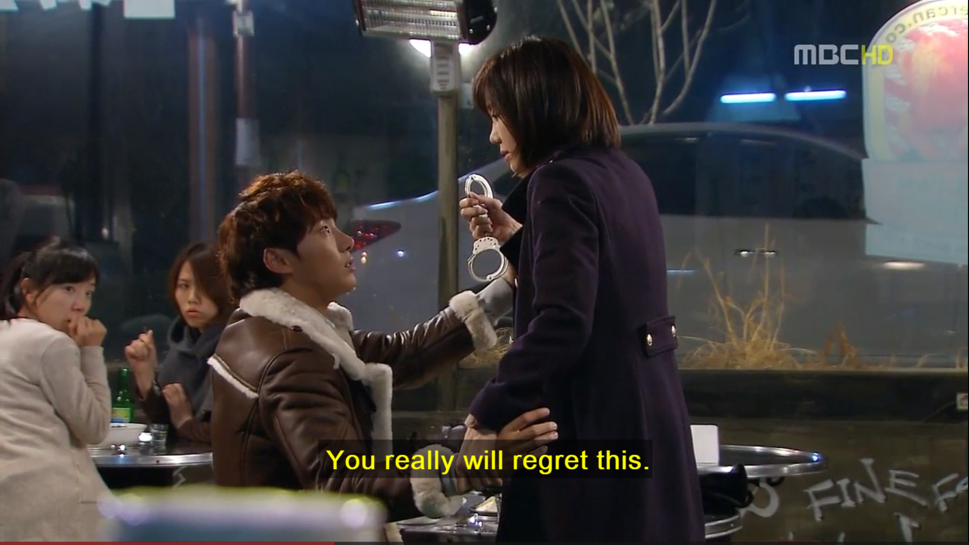 In this scene, our lady cop has just busted her pseudo-boyfriend for stealing a 2 Billion Won purse covered in diamonds. She found it in his motorcycle satchel… pretty incriminating. But as she has the hots for him, she takes him for drinks first… to get his side of the story. Which he tells her. Then asks her to run away with him. Then says he was just kidding about the running thing – which pisses her off and she immediately arrests him in the restaurant – which infuriates him because he’s proclaiming he’s innocent – and then they just start to make out. First he initiates it… then there’s a pause and he tells her once more he didn’t do it… and then she goes back in for more…