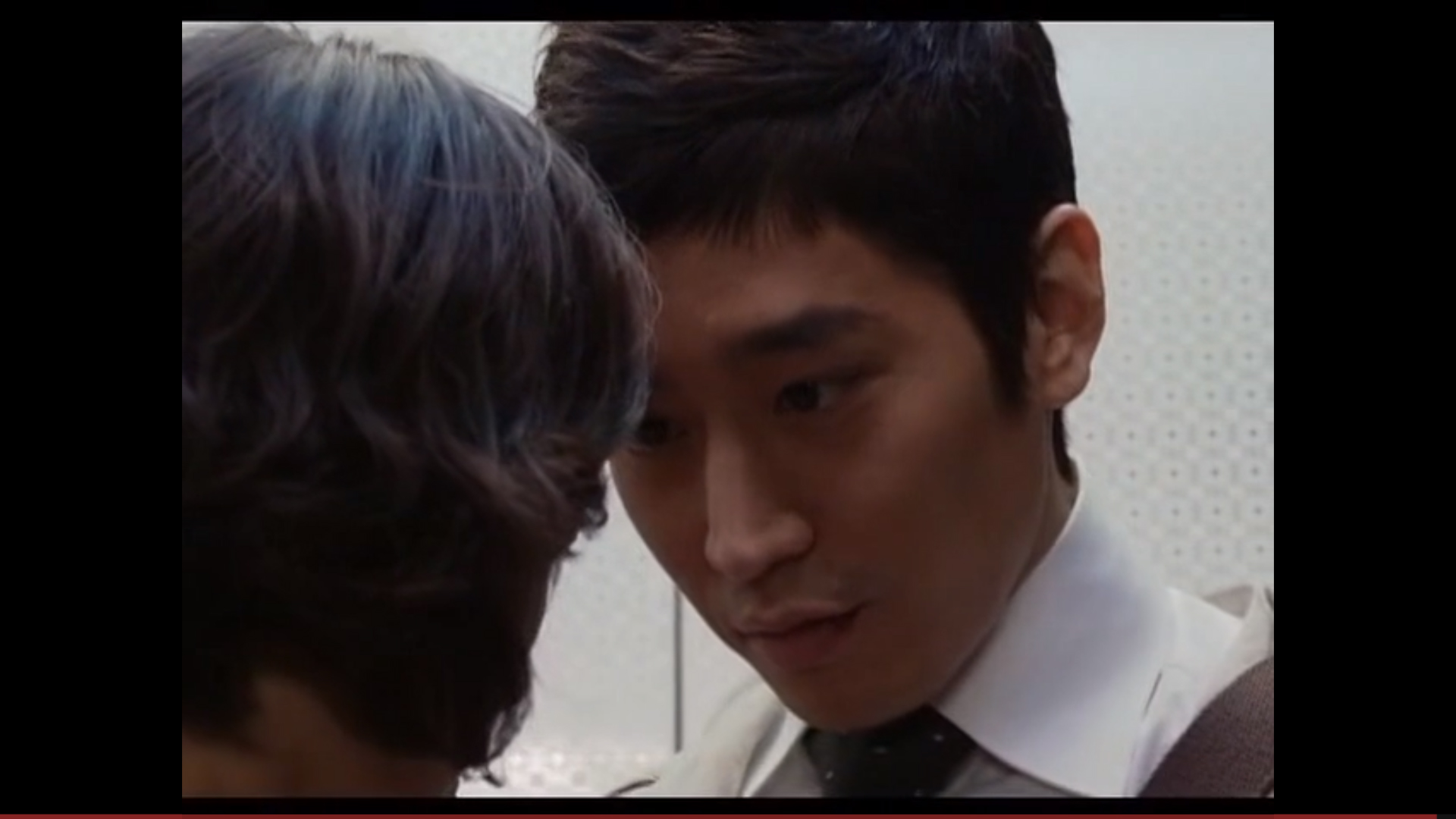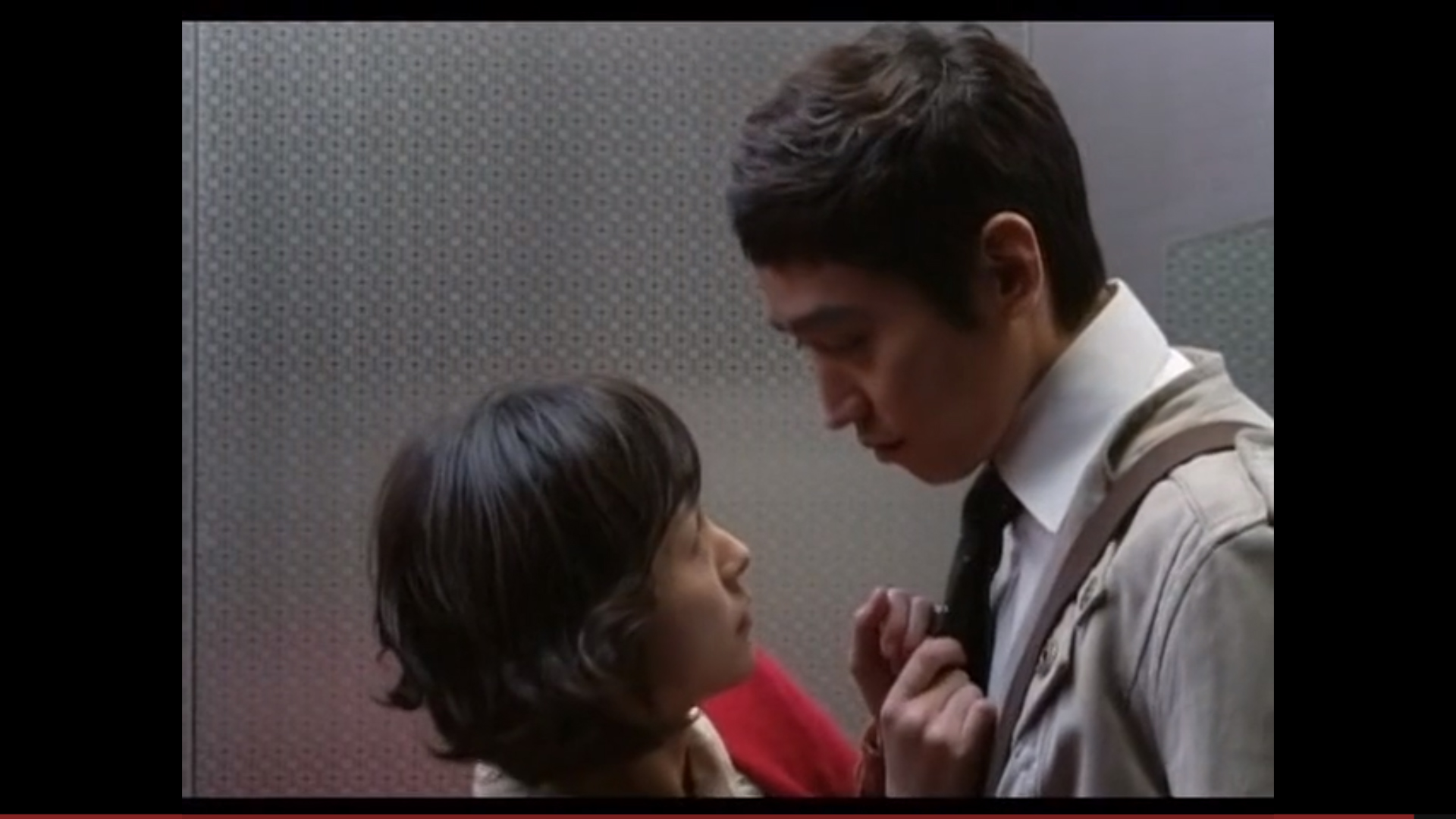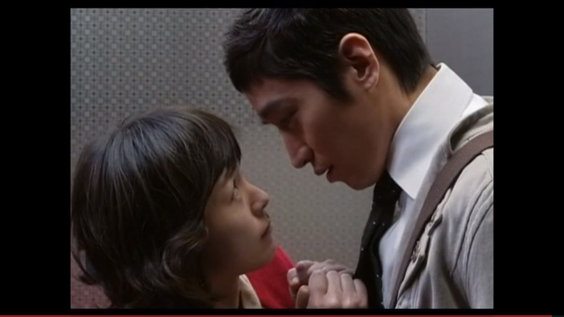 This show is basically just one big sexy timebomb. Seriously. It’s sexy and it knows it. Anyways, the particular kiss in question is between our male lead character who is on a quest for vengeance and retribution and one of his intended targets. This bad bad guy has been driving a married woman crazy by slinking all around her and purring in her ear and teasing her – and she’s about to snap in half with desire. When they’re alone in the elevator together… suddenly all lights turn green and the two GO.