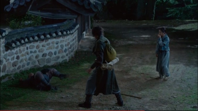 So Moo-Hyul and Boon-Yi run off through the forest.  Ninja Ddang-Sae shows down with our baddie monk and cuts his sword in half before running off into the woods.  And our Scholar Lee Bang-Won just saunters out the front door.