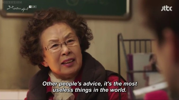 The Romance. The romance is really what this show is about and it never forgets it. The relationship that develops with the two main leads takes it time, unfolds gradually, keeps us anxious and excited. They get closer then back away. Just when one of them is being won over, the other one panics and jumps ship (our male lead literally does this at one point, taking a job on a fishing boat just to get an ocean between himself and his lady love cause he’s so torn up over their fate). She doesn’t think she’s able to open up to anyone. He doesn’t think he’s good enough for anyone. They are both racked with guilt and shame and anger over their traumatic pasts. God, it’s awesome. I simply loved it. Loved it, loved it, loved it.
