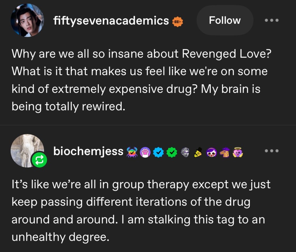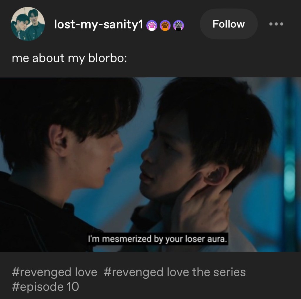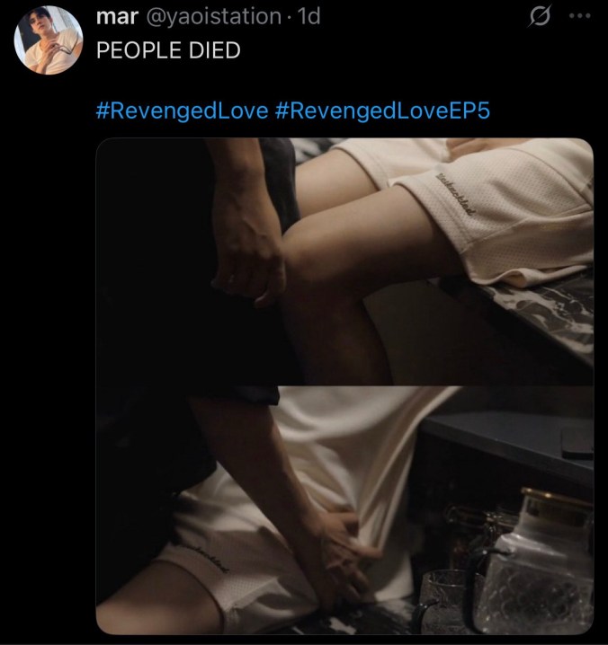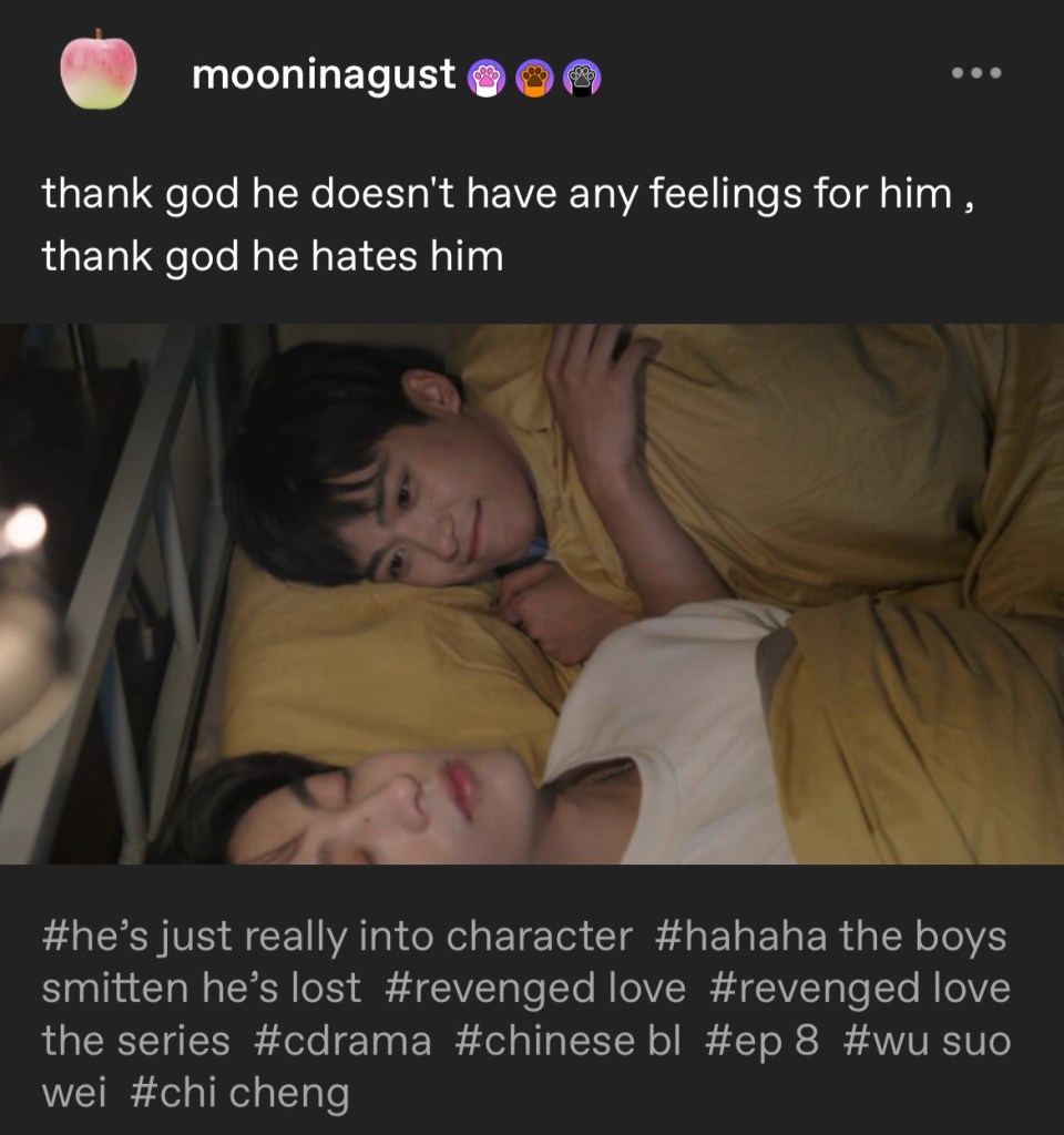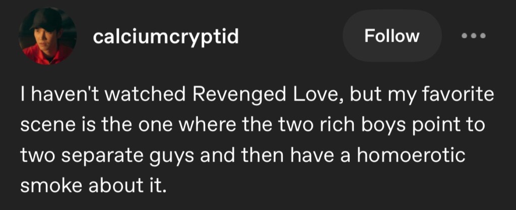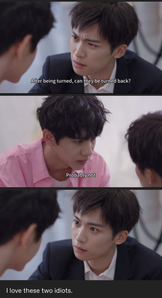 If ya’ll did not know, Revenged Love is based on the novel Counter Attack 柴鸡蛋 by Chai Ji Dan 柴鸡蛋, the same author who wrote Addicted and Advance Bravely. Addicted was the first Asian BL novel I read and I ate it up, but it was tame in comparison to Counter Attack which I read directly after. The source material has fast paced short chapters; yes, it’s sometimes extremely cringe, but it’s also brave enough to casually toss in taboos and insane behavior left and right, it’s very very sexy, and best of all it had me laughing out loud with all the jokes and witty banter. It was a memorable reading experience. The drama Revenged Love is a serviceable live action version. I’m actually quite proud of how much they kept in, while simultaneously being a tad disappointed at what was missing. Oh, the curse of book adaptations, am I right?